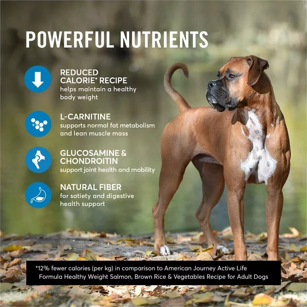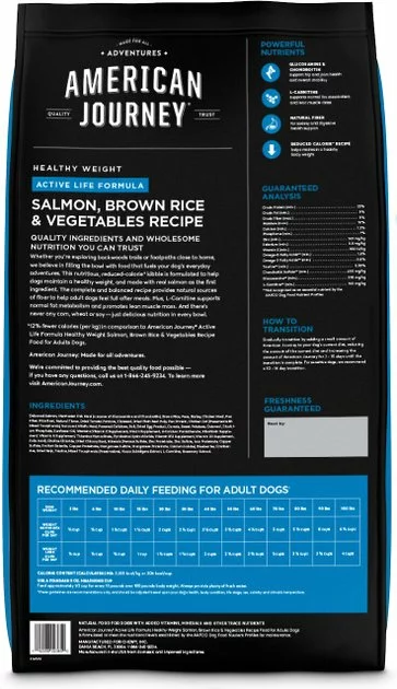 Get your furry explorer trekking his way toward a healthy weight with a delicious, reduced-calorie kibble in every bowl. To help dogs achieve a healthy weight, American Journey Active Life Formula Healthy Weight kibble is formulated with reduced calories, natural sources of fiber to help dogs feel fuller after meals, and L-carnitine to support normal fat metabolism and lean muscle mass. And to help your pal keep up with his daily exercise, it also contains glucosamine and chondroitin to support joint health and mobility. Every meal delivers a complete and balanced diet with real salmon as the first ingredient, along with essential vitamins and minerals, plus nutrient-dense ingredients like sweet potatoes and mineral-rich kelp. There is never any wheat, corn, soy, chicken or poultry by-product meals, or artificial preservatives, colors or artificial flavors.