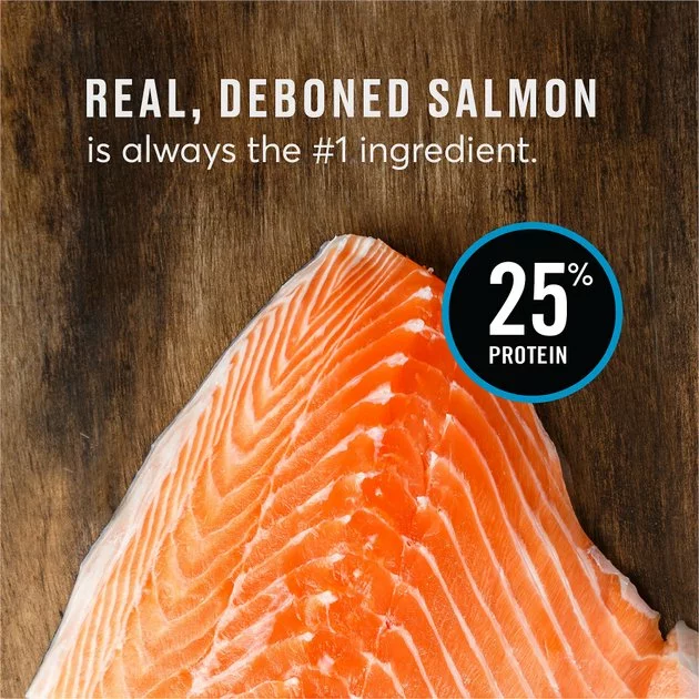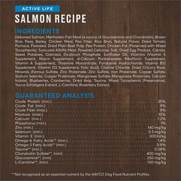 Deboned Salmon, Menhaden Fish Meal (a source of Glucosamine and Chondroitin), Brown Rice, Peas, Barley, Chicken Meal, Pea Fiber, Rice Bran, Natural Flavor, Dried Tomato Pomace, Flaxseed, Dried Plain Beet Pulp, Pea Protein, Chicken Fat (Preserved with Mixed Tocopherols), Suncured Alfalfa Meal, Powered Cellulose, Salt, Dried Egg Product, Carrots, Sweet Potatoes, Oatmeal, Dicalcium Phosphate, Sunflower Oil, Vitamins (Vitamin E Supplement, Niacin Supplement, d-Calcium Pantothenate, Riboflavin Supplement, Vitamin A Supplement, Thiamine Mononitrate, Pyridoxine Hydrochloride, Vitamin B12 Supplement, Vitamin D3 Supplement, Folic Acid), Choline Chloride, Dried Chicory Root, Minerals (Ferrous Sulfate, Zinc Proteinate, Zinc Sulfate, Iron Proteinate, Copper Sulfate, Sodium Selenite, Copper Proteinate, Manganese Sulfate, Manganese Proteinate, Calcium Iodate), Blueberries, Cranberries, Dried Kelp, Taurine, Mixed Tocopherols (Preservative), Yucca Schidigera Extract, L-Carnitine, Rosemary Extract.
