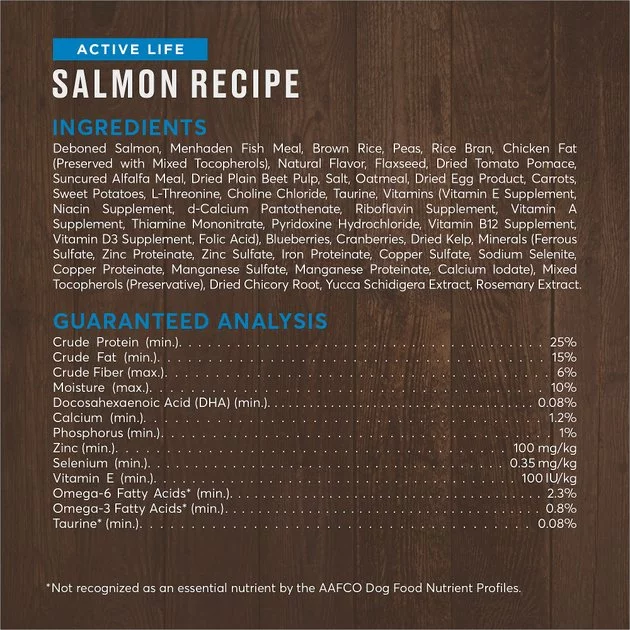 Deboned Salmon, Menhaden Fish Meal, Brown Rice, Peas, Rice Bran, Chicken Fat (Preserved with Mixed Tocopherols), Natural Flavor, Flaxseed, Dried Tomato Pomace, Suncured Alfalfa Meal, Dried Plain Beet Pulp, Salt, Oatmeal, Dried Egg Product, Carrots, Sweet Potatoes, L-Threonine, Choline Chloride, Taurine, Vitamins (Vitamin E Supplement, Niacin Supplement, d-Calcium Pantothenate, Riboflavin Supplement, Vitamin A Supplement, Thiamine Mononitrate, Pyridoxine Hydrochloride, Vitamin B12 Supplement, Vitamin D3 Supplement, Folic Acid), Blueberries, Cranberries, Dried Kelp, Minerals (Ferrous Sulfate, Zinc Proteinate, Zinc Sulfate, Iron Proteinate, Copper Sulfate, Sodium Selenite, Copper Proteinate, Manganese Sulfate, Manganese Proteinate, Calcium Iodate), Mixed Tocopherols (Preservative), Dried Chicory Root, Yucca Schidigera Extract, Rosemary Extract.