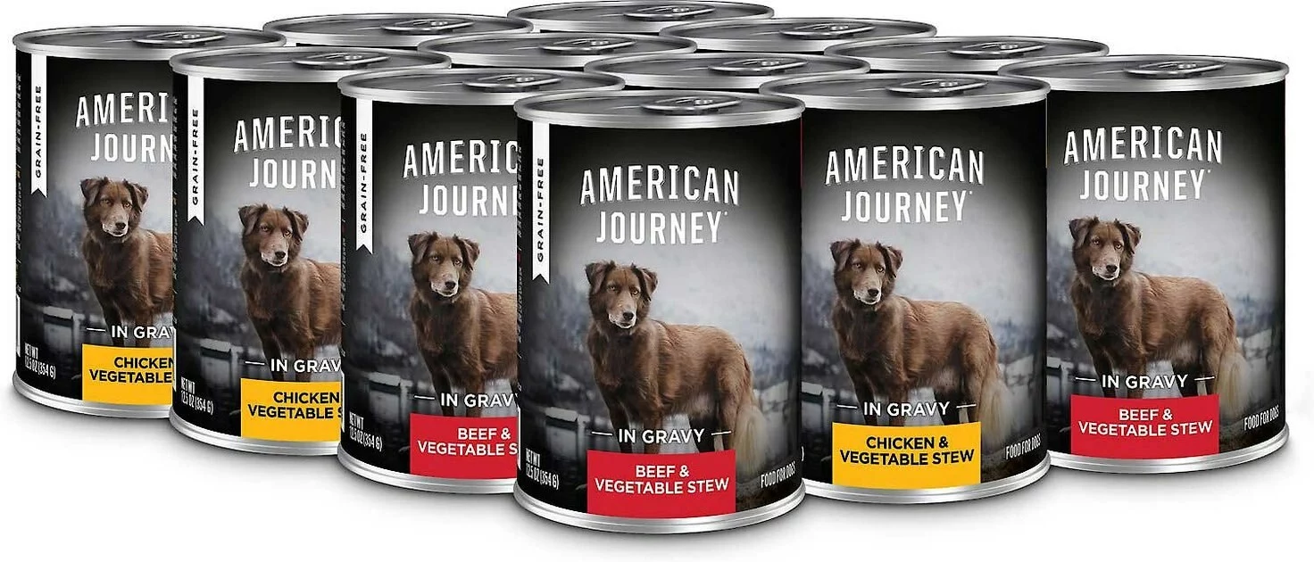 - American Journey Stews Poultry & Beef Variety Pack Grain-Free Canned Dog Food combines high-quality beef or chicken with wholesome carrots, simmered in a savory broth for the flavor dogs love and crave.