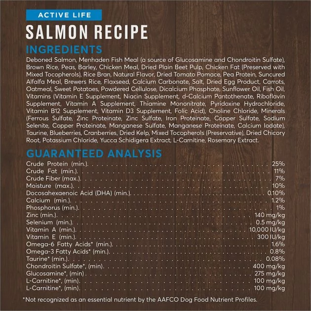 Deboned Salmon, Menhaden Fish Meal (a source of Glucosamine and Chondroitin Sulfate), Brown Rice, Peas, Barley, Chicken Meal, Dried Plain Beet Pulp, Chicken Fat (Preserved with Mixed Tocopherols), Rice Bran, Natural Flavor, Dried Tomato Pomace, Pea Protein, Suncured Alfalfa Meal, Brewers Rice, Flaxseed, Calcium Carbonate, Salt, Dried Egg Product, Carrots, Oatmeal, Sweet Potatoes, Powdered Cellulose, Dicalcium Phosphate, Sunflower Oil, Fish Oil, Vitamins (Vitamin E Supplement, Niacin Supplement, d-Calcium Pantothenate, Riboflavin Supplement, Vitamin A Supplement, Thiamine Mononitrate, Pyridoxine Hydrochloride, Vitamin B12 Supplement, Vitamin D3 Supplement, Folic Acid), Choline Chloride, Minerals (Ferrous Sulfate, Zinc Proteinate, Zinc Sulfate, Iron Proteinate, Copper Sulfate, Sodium Selenite, Copper Proteinate, Manganese Sulfate, Manganese Proteinate, Calcium Iodate), Taurine, Blueberries, Cranberries, Dried Kelp, Mixed Tocopherols (Preservative), Dried Chicory Root, Potassium Chloride, Yucca Schidigera Extract, L-Carnitine, Rosemary Extract.