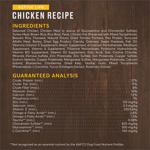Deboned Chicken, Chicken Meal (a source of Glucosamine and Chondroitin Sulfate), Turkey Meal, Brown Rice, Rice Bran, Peas, Chicken Fat (Preserved with Mixed Tocopherols), Brewers Rice, Flaxseed, Natural Flavor, Dried Tomato Pomace, Pea Protein, Suncured Alfalfa Meal, Barley, Dried Egg Product, Carrots, Oatmeal, Sweet Potatoes, Fish Oil, Vitamins (Vitamin E Supplement, Niacin Supplement, d-Calcium Pantothenate, Riboflavin Supplement, Vitamin A Supplement, Thiamine Mononitrate, Pyridoxine Hydrochloride, Vitamin B12 Supplement, Vitamin D3 Supplement, Folic Acid), Salt, Choline Chloride, Minerals (Ferrous Sulfate, Zinc Proteinate, Zinc Sulfate, Iron Proteinate, Copper Sulfate, Sodium Selenite, Copper Proteinate, Manganese Sulfate, Manganese Proteinate, Calcium Iodate), Blueberries, Cranberries, Dried Kelp, Taurine, Inulin, Mixed Tocopherols (Preservative), L-Carnitine, Yucca Schidigera Extract, Rosemary Extract.
