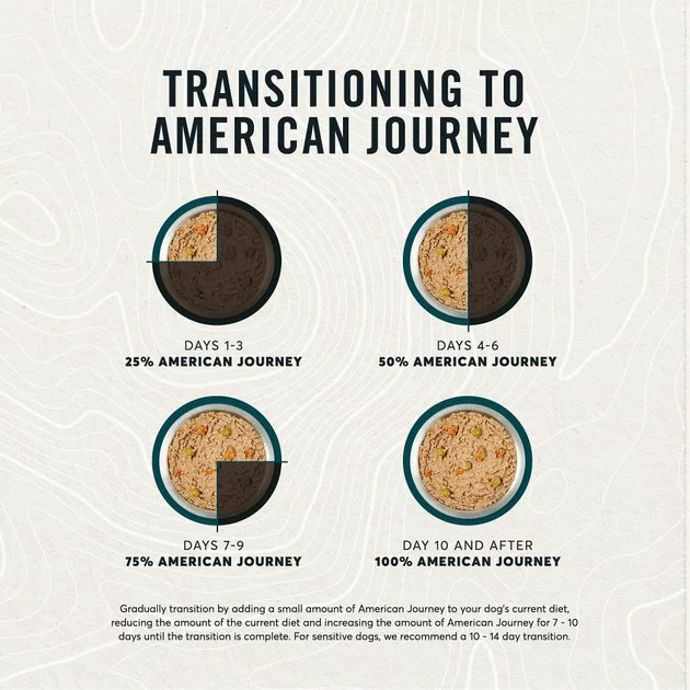 Gradually transition by adding a small amount of American Journey to your dog’s current diet, reducing the amount of the current diet and increasing the amount of American Journey for 7 – 10 days until the transition is complete. For sensitive dogs, we recommend a 10 – 14 day transition.