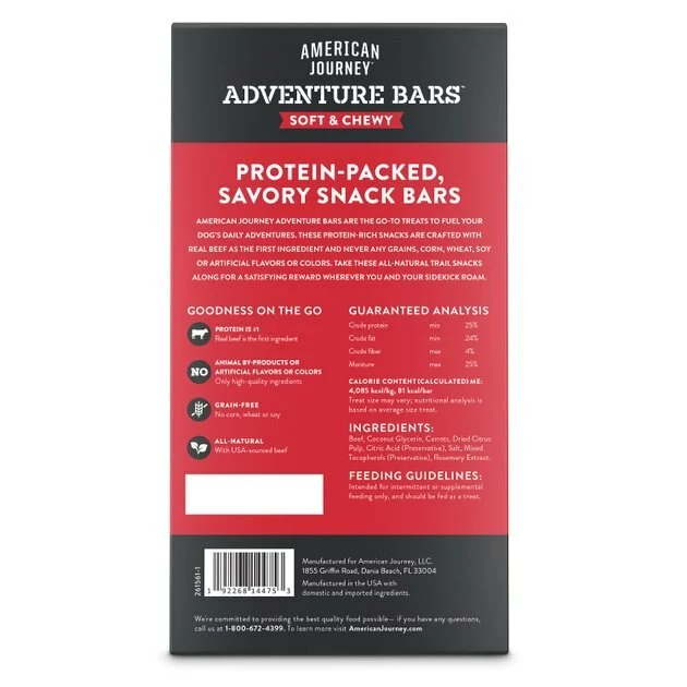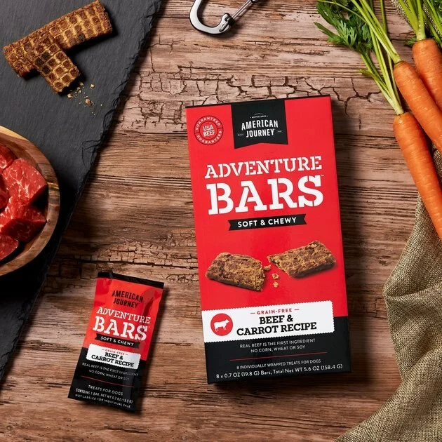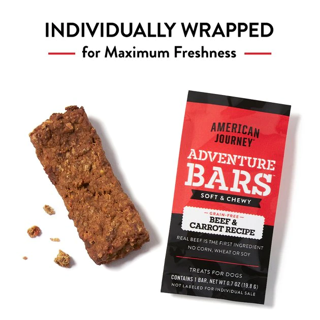 Made to reward the explorer in every dog, American Journey Adventure Bars are the perfect treat for some protein on the go. Every recipe starts with real, USA-raised beef as the first ingredient for the hearty, meaty flavor dogs adore. Perfect for wherever the trail leads you, each bar is individually wrapped to seal in the freshness, flavor and chewy texture of these satisfying snacks. Every bite also provides essential vitamins and antioxidants from wholesome ingredients like carrots. Crafted with no grains, wheat, corn or soy ingredients, by-product meals or artificial preservatives, flavors or colors, these all-natural treats are raising the bar for adventure-seeking pups.