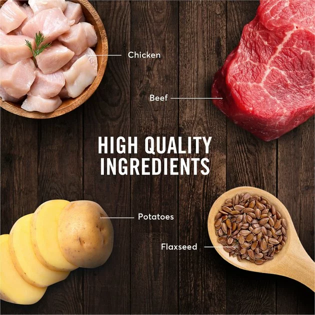 Beef, Chicken, Beef Broth, Chicken Liver, Potatoes, Flaxseed, Natural Flavor, Guar Gum, Salt, Cassia Gum, Xanthan Gum, Potassium Chloride, Sunflower Oil, Fish Oil (Preserved with Mixed Tocopherols), Choline Chloride, Yucca Schidigera Extract, Zinc Proteinate, Iron Proteinate, Tricalcium Phosphate, Vitamin E Supplement, Copper Proteinate, Manganese Proteinate, Sodium Selenite, Thiamine Mononitrate, Cobalt Proteinate, Niacin Supplement, d-Calcium Pantothenate, Vitamin A Supplement, Riboflavin Supplement, Biotin, Vitamin B12 Supplement, Potassium Iodide, Pyridoxine Hydrochloride, Vitamin D3 Supplement, Folic Acid, Rosemary Extract.