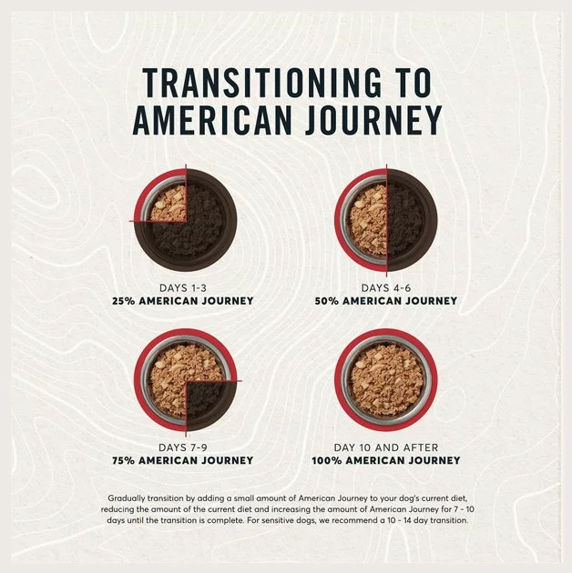 If you plan on transitioning to a new American Journey canned dog food flavor, we recommend mixing the food gradually for 7-10 days until the transition is complete. For sensitive dogs, we recommend a 10-14-day transition.