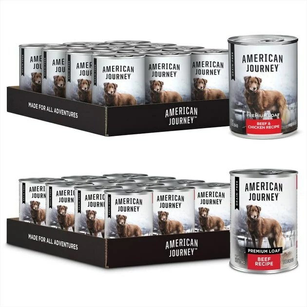 - American Journey Beef & Chicken Recipe Grain-Free Canned Dog Food, 12.5-oz, case of 12—Solid nutrition in a grain-free recipe that fuels your dog’s daily adventures. There’s no corn, wheat or soy to help avoid food sensitivities.