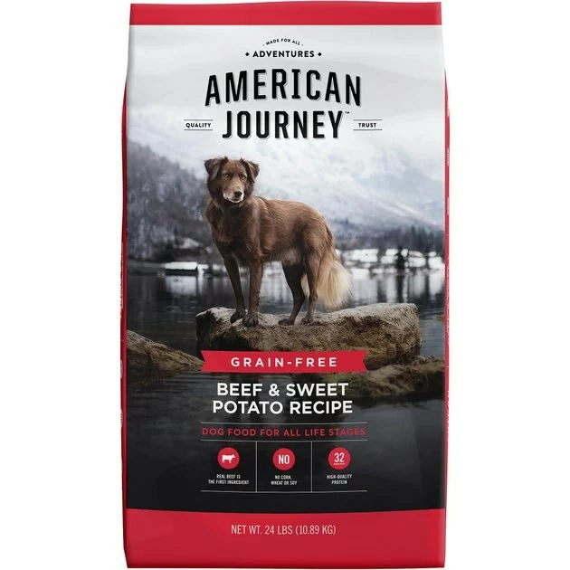 - American Journey Beef & Sweet Potato Recipe Grain-Free Dry Dog Food, 24-lb bag—Grain-free dog food that’s also free of corn, wheat and soy to help food sensitive pets avoid fillers that might upset their stomach.