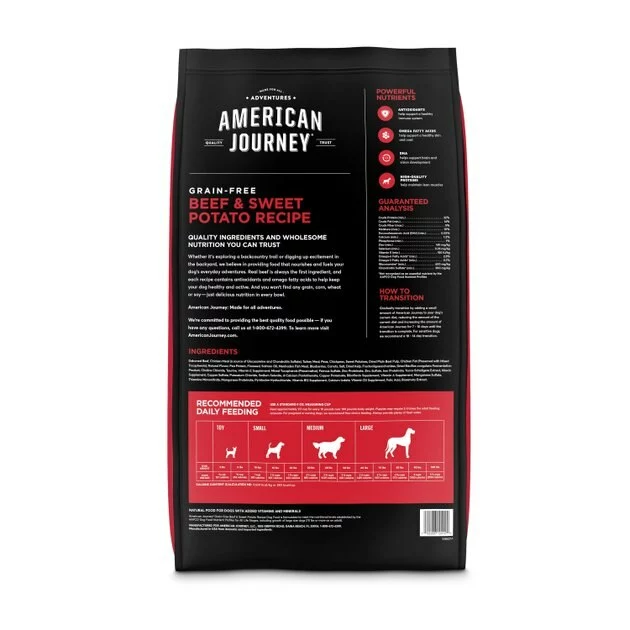 - American Journey Beef & Sweet Potato Recipe Grain-Free Dry Dog Food, 24-lb bag—Nutritious fruits and vegetables like blueberries, carrots and dried kelp provide vitamins, minerals, antioxidants for immune system support, and phytonutrients.