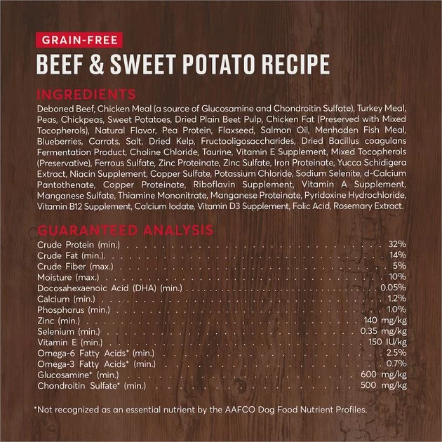 Deboned Beef, Chicken Meal (a source of Glucosamine and Chondroitin Sulfate), Turkey Meal, Peas, Chickpeas, Sweet Potatoes, Dried Plain Beet Pulp, Chicken Fat (Preserved with Mixed Tocopherols), Natural Flavor, Pea Protein, Flaxseed, Salmon Oil, Menhaden Fish Meal, Blueberries, Carrots, Salt, Dried Kelp, Fructooligosaccharides, Dried Bacillus coagulans Fermentation Product, Choline Chloride, Taurine, Vitamin E Supplement, Mixed Tocopherols (Preservative), Ferrous Sulfate, Zinc Proteinate, Zinc Sulfate, Iron Proteinate, Yucca Schidigera Extract, Niacin Supplement, Copper Sulfate, Potassium Chloride, Sodium Selenite, d-Calcium Pantothenate, Copper Proteinate, Riboflavin Supplement, Vitamin A Supplement, Manganese Sulfate, Thiamine Mononitrate, Manganese Proteinate, Pyridoxine Hydrochloride, Vitamin B12 Supplement, Calcium Iodate, Vitamin D3 Supplement, Folic Acid, Rosemary Extract.