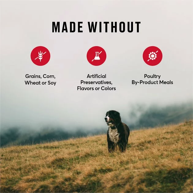 - Grain-free dog food that’s also free of corn, wheat and soy to help food sensitive pets avoid fillers that might upset their stomach.