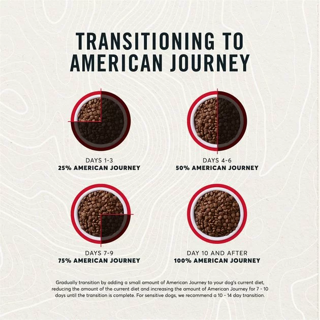 If you plan on transitioning to a new American Journey kibble flavor, we recommend mixing the food gradually for 7-10 days until the transition is complete. For sensitive dogs, we recommend a 10-14-day transition.