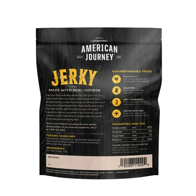 American Journey Chicken Jerky Grain-Free Dog Treats are intended for intermittent or supplemental feeding only, and should be fed as a treat.