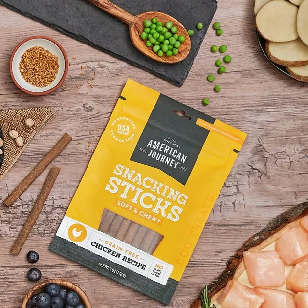 Reward your sidekick with a chewy, tasty treat that’s perfect for anytime snacking. American Journey Soft & Chewy Snacking Sticks are moist, soft treats that are crafted with real chicken as the first ingredient for the taste dogs crave. Give them whole for a satisfying snack or break them up into smaller bites for training. They’re crafted to provide the chewy texture dogs love, and loaded with nutrient-dense, easily digestible ingredients like peas, sweet potatoes, chickpeas and blueberries. Plus, they’re a source of omega fatty acids from flaxseed to support a healthy skin and coat.