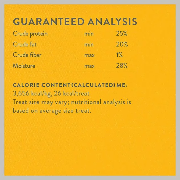 3,656 kcal/kg, 26 kcal/treat. Treat size may vary, nutritional analysis is based on average size treat.