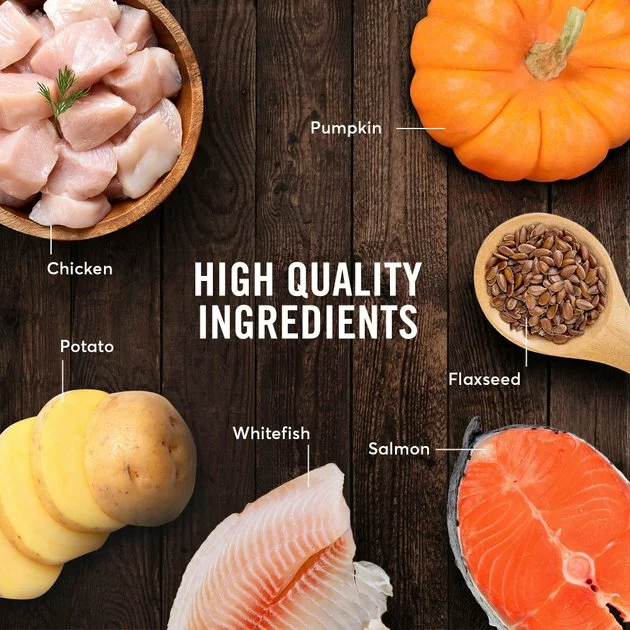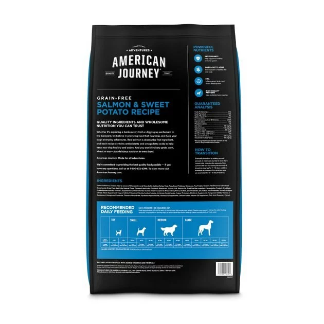 - American Journey Salmon & Sweet Potato Recipe Grain-Free Dry Dog Food, 24-lb bag—Nutritious fruits and vegetables like blueberries, carrots and dried kelp provide vitamins, minerals, antioxidants for immune system support, and phytonutrients.