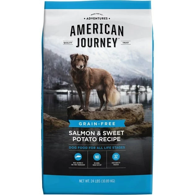 American Journey Salmon & Sweet Potato Recipe Grain-Free Dry Dog Food, 24-lb bag—American Journey is full of nutritious ingredients that fuel your pet’s everyday adventures. The Salmon & Sweet Potato Recipe Grain-Free Dry Dog Food formula features real, deboned salmon with the protein and amino acids your dog needs for leaner muscles, and the exceptional flavor she instinctively craves. Delicious sweet potatoes and chickpeas are included to give your pup energy that lasts. With wholesome fruits and veggies like carrots, dried kelp and blueberries, your dog is getting beneficial fiber, phytonutrients and antioxidants. Omega fatty acids are plentiful, including DHA, an omega-3 that supports healthy development of the brain and eyes. These omegas come from several sources like salmon oil and flaxseed, and they help keep your fellow adventurer’s skin and coat healthy. This recipe is grain-free and has no corn, wheat or soy, which makes it a great choice for dogs that are prone to food sensitivities.