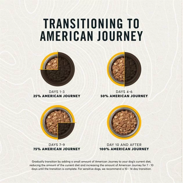 If you plan on transitioning to a new American Journey canned dog food flavor, we recommend mixing the food gradually for 7-10 days until the transition is complete. For sensitive dogs, we recommend a 10-14-day transition.