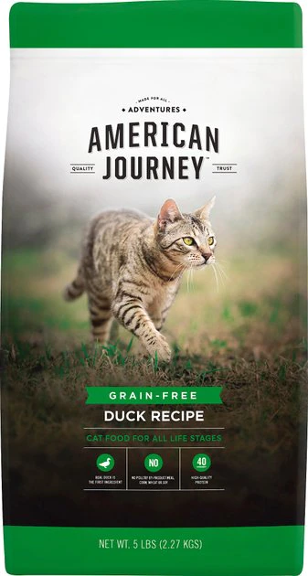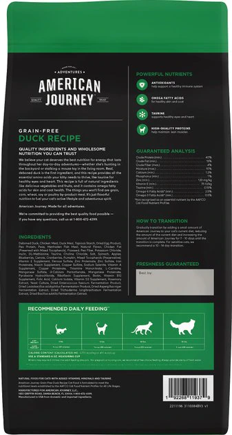 Your cat needs the high-quality nutrition to keep her going for a full day of adventure. American Journey Duck Recipe Grain-Free Dry Cat Food is a grain-free meal she’ll love, designed to fuel her curious nature and active lifestyle. Made without grains, this kibble features real, deboned duck as the first ingredient, and wholesome fruits and vegetables. It’s carefully crafted in the USA with ingredients from around the world, and no poultry by-product meal, corn, wheat, soy or artificial preservatives. This delicious recipe delivers 40% protein, plus powerful nutrients and essential amino acids. American Journey cat food gives your kitty antioxidants to support a healthy immune system, taurine for healthy eyes and heart, and omega fatty acids for skin and coat health. She’ll get everything she needs in a satisfying meal that offers solid nutrition for any adventure.
