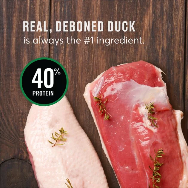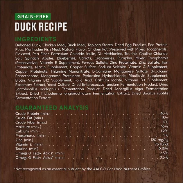 Deboned Duck, Chicken Meal, Duck Meal, Tapioca Starch, Dried Egg Product, Pea Protein, Peas, Menhaden Fish Meal, Natural Flavor, Chicken Fat (Preserved with Mixed Tocopherols), Flaxseed, Pea Fiber, Potassium Chloride, Inulin, DL-Methionine, Taurine, Choline Chloride, Salt, Spinach, Apples, Blueberries, Carrots, Cranberries, Pumpkin, Mixed Tocopherols (Preservative), Vitamin E Supplement, Ferrous Sulfate, Zinc Proteinate, Zinc Sulfate, Iron Proteinate, Niacin Supplement, Copper Sulfate, Sodium Selenite, Vitamin A Supplement, Copper Proteinate, Thiamine Mononitrate, L-Carnitine, Manganese Sulfate, D-Calcium Pantothenate, Manganese Proteinate, Pyridoxine Hydrochloride, Riboflavin Supplement, Biotin, Vitamin B12 Supplement, Folic Acid, Calcium Iodate, Vitamin D3 Supplement, Rosemary Extract, Yeast Culture, Dried Enterococcus Faecium Fermentation Product, Dried Lactobacillus Acidophilus Fermentation Product, Dried Aspergillus Niger Fermentation Extract, Dried Trichoderma Longibrachiatum Fermentation Extract, Dried Bacillus Subtilis Fermentation Extract.