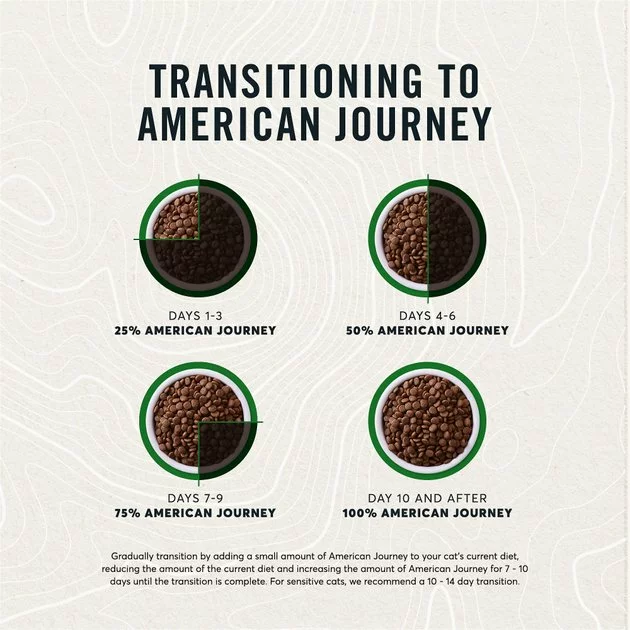 Gradually transition by adding a small amount of American Journey to your cat’s current diet, gradually reducing the amount of the current diet and increasing the amount of American Journey for 7-10 days until the transition is complete. For sensitive cats, we recommend a 10 – 14 day transition.