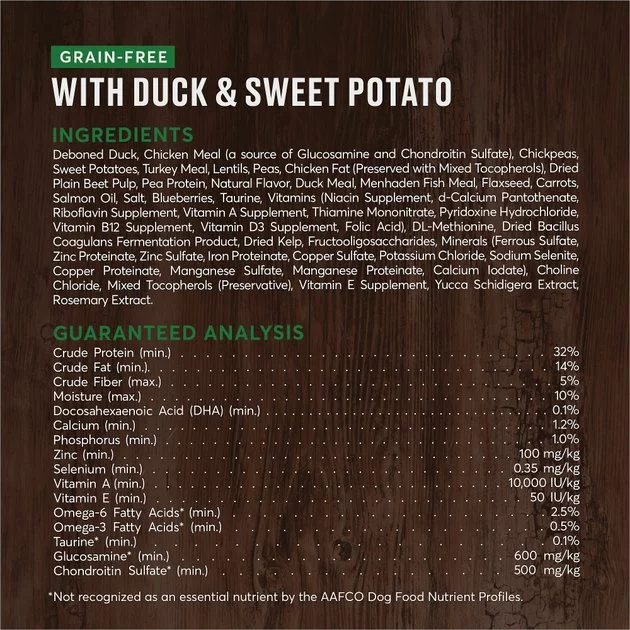Deboned Duck, Chicken Meal (a source of Glucosamine and Chondroitin Sulfate), Chickpeas, Sweet Potatoes, Turkey Meal, Lentils, Peas, Chicken Fat (Preserved with Mixed Tocopherols), Dried Plain Beet Pulp, Pea Protein, Natural Flavor, Duck Meal, Menhaden Fish Meal, Flaxseed, Carrots, Salmon Oil, Salt, Blueberries, Taurine, Vitamins (Niacin Supplement, d-Calcium Pantothenate, Riboflavin Supplement, Vitamin A Supplement, Thiamine Mononitrate, Pyridoxine Hydrochloride, Vitamin B12 Supplement, Vitamin D3 Supplement, Folic Acid), DL-Methionine, Dried Bacillus coagulans Fermentation Product, Dried Kelp, Fructooligosaccharides, Minerals (Ferrous Sulfate, Zinc Proteinate, Zinc Sulfate, Iron Proteinate, Copper Sulfate, Potassium Chloride, Sodium Selenite, Copper Proteinate, Manganese Sulfate, Manganese Proteinate, Calcium Iodate), Choline Chloride, Mixed Tocopherols (Preservative), Vitamin E Supplement, Yucca Schidigera Extract, Rosemary Extract.