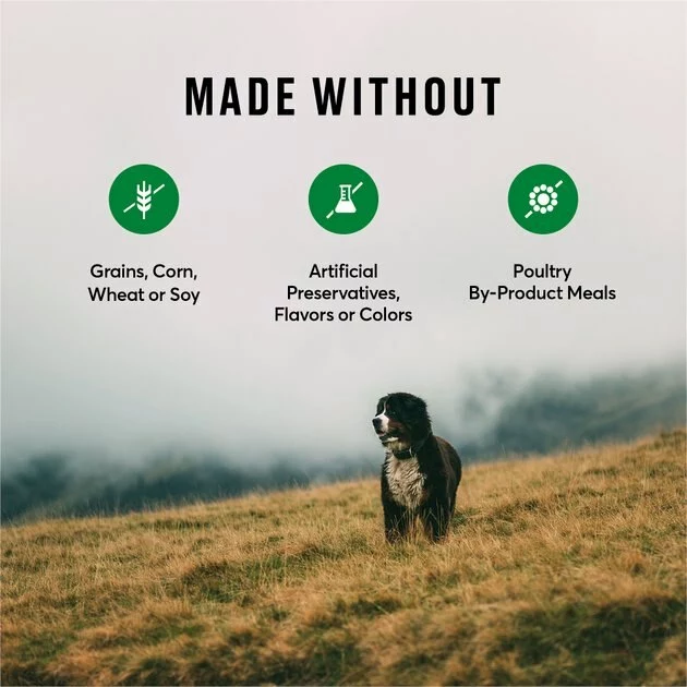- Grain-free dog food that’s also free of corn, wheat and soy to help food sensitive pets avoid ingredients that might upset their stomach.