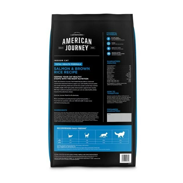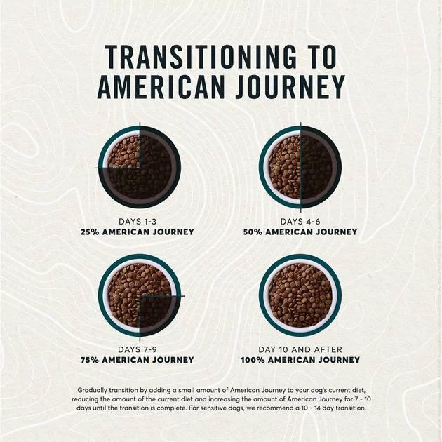 Gradually transition by adding a small amount of American Journey to your cat’s current diet, reducing the amount of the current diet and increasing the amount of American Journey for 7-10 days until the transition is complete. For sensitive cats, we recommend a 10 – 14 day transition.