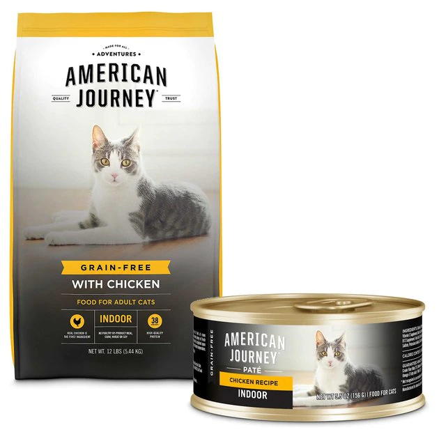 - Each purchase comes with American Journey Indoor Recipe with Chicken Grain-Free Dry Cat Food, 12-lb bag & American Journey Indoor Pate Chicken Recipe Grain-Free Canned Cat Food, 5.5-oz, case of 24.