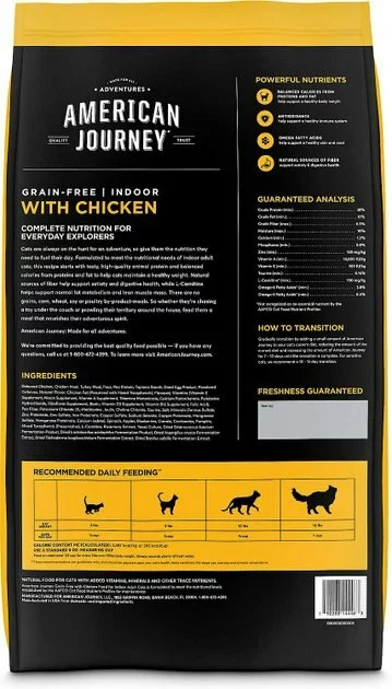- American Journey Indoor Recipe with Chicken Grain-Free Dry Cat Food contains L-carnitine, omega fatty acids, and essential vitamins and minerals to support your feline friend’s metabolism, muscles, immune system, skin and coat.
