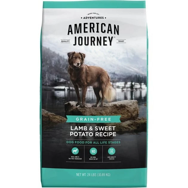 American Journey Lamb & Sweet Potato Recipe Grain-Free Dry Dog Food, 24-lb bag—American Journey is full of nutritious ingredients that fuel your pet’s everyday adventures. The Lamb & Sweet Potato Recipe Grain-Free Dry Dog Food formula features real, deboned lamb with the protein and amino acids your dog needs for leaner muscles, and the exceptional flavor she instinctively craves. Delicious sweet potatoes and chickpeas are included to give your pup energy that lasts. With wholesome fruits and veggies like carrots, dried kelp and blueberries, your dog is getting beneficial fiber, phytonutrients and antioxidants. Omega fatty acids are plentiful, including DHA, an omega-3 that supports healthy development of the brain and eyes. These omegas come from several sources like salmon oil and flaxseed, and they help keep your fellow adventurer’s skin and coat healthy. This recipe is grain-free and has no corn, wheat or soy, which makes it a great choice for dogs that are prone to food sensitivities.