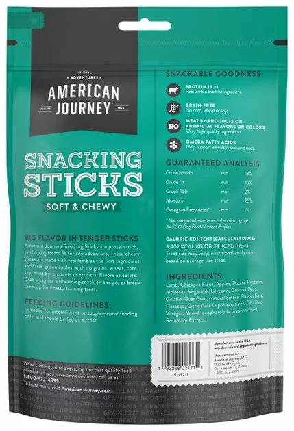 Reward your sidekick with a chewy, tasty treat that’s perfect for anytime snacking. American Journey Soft & Chewy Snacking Sticks are moist, soft treats that are crafted with real lamb as the first ingredient for the taste dogs crave. Give them whole for a satisfying snack or break them up into smaller bites for training. They’re crafted to provide the chewy texture dogs love, and loaded with nutrient-dense, easily digestible ingredients like peas, sweet potatoes, chickpeas and apples. Plus, they’re a source of omega fatty acids from flaxseed to support a healthy skin and coat.