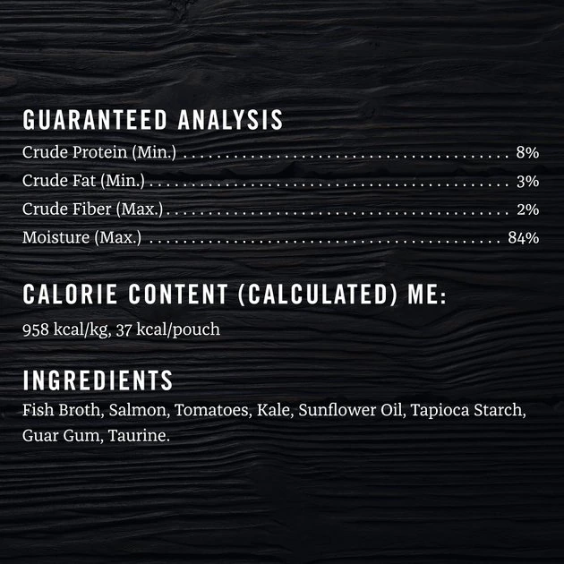 Fish Broth, Salmon, Tomatoes, Kale, Sunflower Oil, Tapioca Starch, Guar Gum, Taurine. “