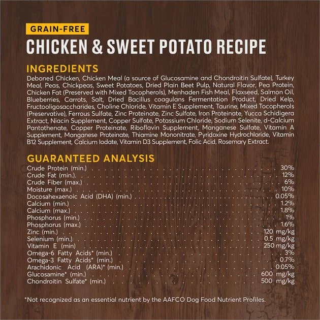 Deboned Chicken, Chicken Meal (a source of Glucosamine and Chondroitin Sulfate), Turkey Meal, Peas, Chickpeas, Sweet Potatoes, Dried Plain Beet Pulp, Natural Flavor, Pea Protein, Chicken Fat (Preserved with Mixed Tocopherols), Menhaden Fish Meal, Flaxseed, Salmon Oil, Blueberries, Carrots, Salt, Dried Bacillus coagulans Fermentation Product, Dried Kelp, Fructooligosaccharides, Choline Chloride, Vitamin E Supplement, Taurine, Mixed Tocopherols (Preservative), Ferrous Sulfate, Zinc Proteinate, Zinc Sulfate, Iron Proteinate, Yucca Schidigera Extract, Niacin Supplement, Copper Sulfate, Potassium Chloride, Sodium Selenite, d-Calcium Pantothenate, Copper Proteinate, Riboflavin Supplement, Manganese Sulfate, Vitamin A Supplement, Manganese Proteinate, Thiamine Mononitrate, Pyridoxine Hydrochloride, Vitamin B12 Supplement, Calcium Iodate, Vitamin D3 Supplement, Folic Acid, Rosemary Extract.