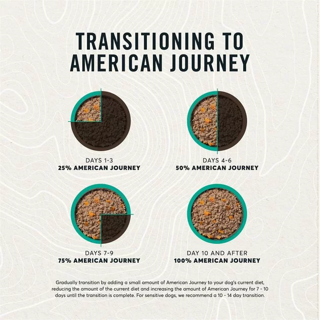Gradually transition by adding a small amount of American Journey to your dog’s current diet, reducing the amount of the current diet and increasing the amount of American Journey for 7 – 10 days until the transition is complete. For sensitive dogs, we recommend a 10 – 14 day transition.