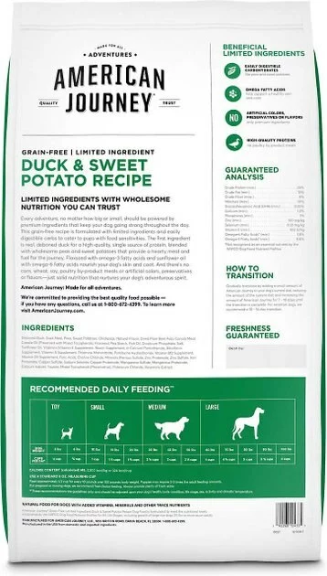 - American Journey Limited Ingredient Grain-Free Duck & Sweet Potato Recipe Dry Dog Food delivers high-quality animal proteins that help maintain lean muscles and is made with 25% protein and starts with deboned duck as the first ingredient.