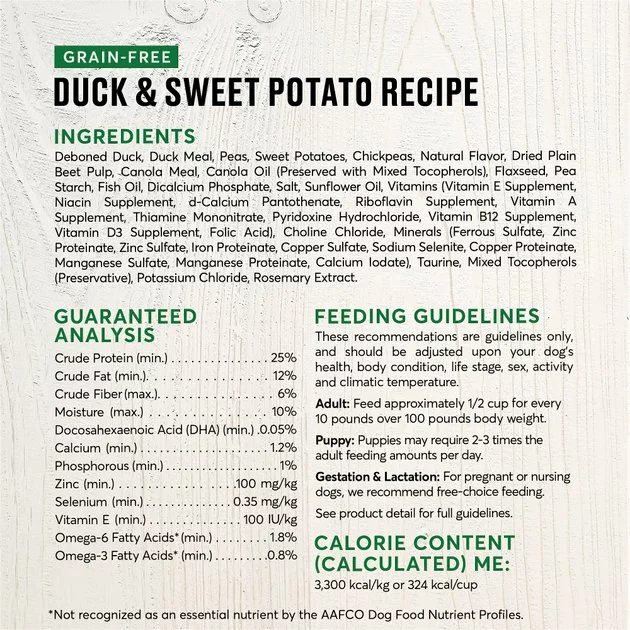 Deboned Duck, Duck Meal, Peas, Sweet Potatoes, Chickpeas, Natural Flavor, Dried Plain Beet Pulp, Canola Meal, Canola Oil (Preserved with Mixed Tocopherols), Flaxseed, Pea Starch, Fish Oil, Dicalcium Phosphate, Salt, Sunflower Oil, Vitamins (Vitamin E Supplement, Niacin Supplement, d-Calcium Pantothenate, Riboflavin Supplement, Vitamin A Supplement, Thiamine Mononitrate, Pyridoxine Hydrochloride, Vitamin B12 Supplement, Vitamin D3 Supplement, Folic Acid), Choline Chloride, Minerals (Ferrous Sulfate, Zinc Proteinate, Zinc Sulfate, Iron Proteinate, Copper Sulfate, Sodium Selenite, Copper Proteinate, Manganese Sulfate, Manganese Proteinate, Calcium Iodate), Taurine, Mixed Tocopherols (Preservative), Potassium Chloride, Rosemary Extract.