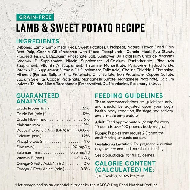 Deboned Lamb, Lamb Meal, Peas, Sweet Potatoes, Chickpeas, Natural Flavor, Dried Plain Beet Pulp, Canola Oil (Preserved with Mixed Tocopherols), Canola Meal, Pea Starch, Flaxseed, Fish Oil, Dicalcium Phosphate, Salt, Sunflower Oil, Potassium Chloride, Vitamins (Vitamin E Supplement, Niacin Supplement, d-Calcium Pantothenate, Riboflavin Supplement, Vitamin A Supplement, Thiamine Mononitrate, Pyridoxine Hydrochloride, Vitamin B12 Supplement, Vitamin D3 Supplement, Folic Acid), Choline Chloride, L-Threonine, Minerals (Ferrous Sulfate, Zinc Proteinate, Zinc Sulfate, Iron Proteinate, Copper Sulfate, Sodium Selenite, Copper Proteinate, Manganese Sulfate, Manganese Proteinate, Calcium Iodate), Taurine, Mixed Tocopherols (Preservative), DL-Methionine, Rosemary Extract.