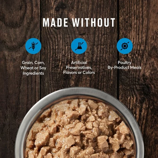 - Grain-free recipe made without corn, soy and wheat and made without poultry by-product meal or artificial colors, flavors or preservatives; packed in BPA non-intent cans for safety.