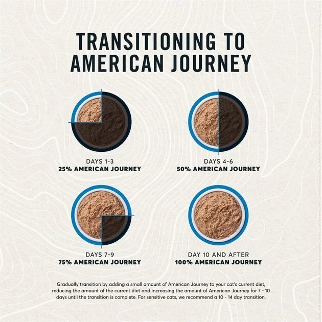 If you plan on transitioning to a new American Journey canned cat food flavor, we recommend mixing the food gradually for 7-10 days until the transition is complete. For sensitive cats, we recommend a 10-14-day transition.