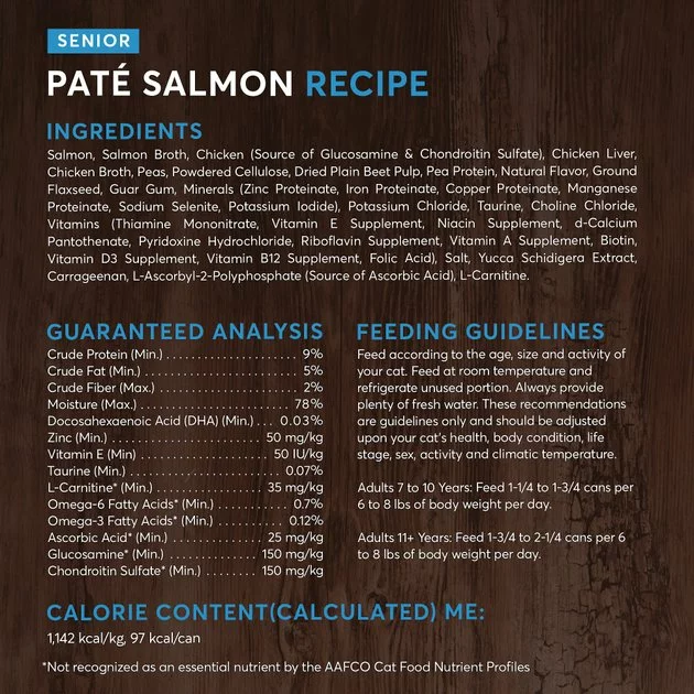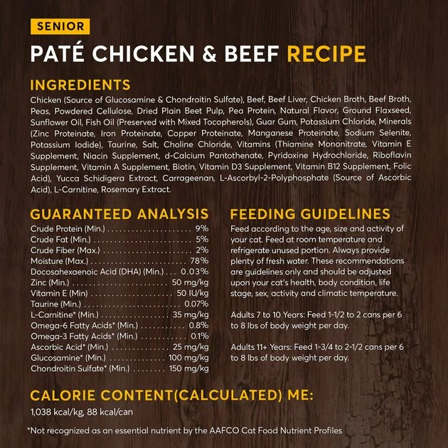 Serve up meals to keep your senior kitty thriving with recipes that are specially formulated to support a healthy life. Real poultry, beef or fish is always the first ingredient and provides high-quality animal protein in a smooth paté texture that’s perfect for sensitive teeth. 100% complete and balanced, every recipe includes natural fiber and prebiotics to promote digestive health, DHA and taurine to support brain and heart health, and glucosamine and chondroitin to support healthy joints. Let your senior kitty savor all the special moments ahead with healthy recipes crafted with the nutrition they need and the protein they crave.