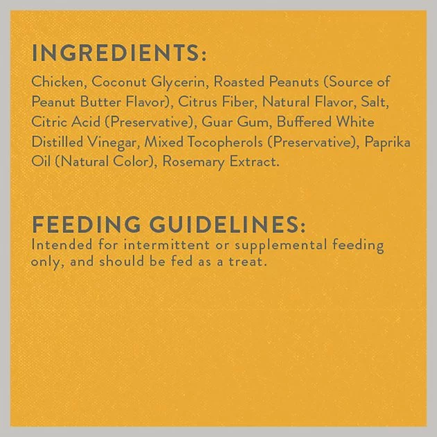 Chicken, Coconut Glycerin, Roasted Peanuts (Source of Peanut Butter Flavor), Citrus Fiber, Natural Flavor, Salt, Citric Acid (Preservative), Guar Gum, Buffered White Distilled Vinegar, Mixed Tocopherols (Preservative), Paprika Oil (Natural Color), Rosemary Extract.