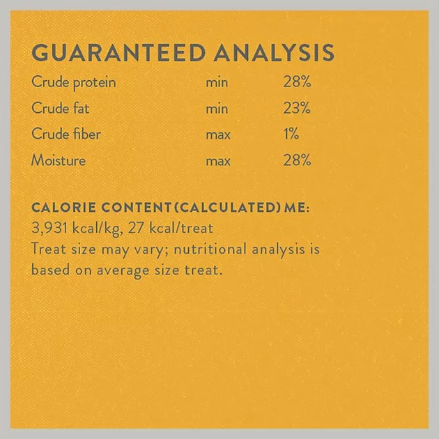3,931 kcal/kg, 27 kcal/treat. Treat size may vary, nutritional analysis is based on average size treat.