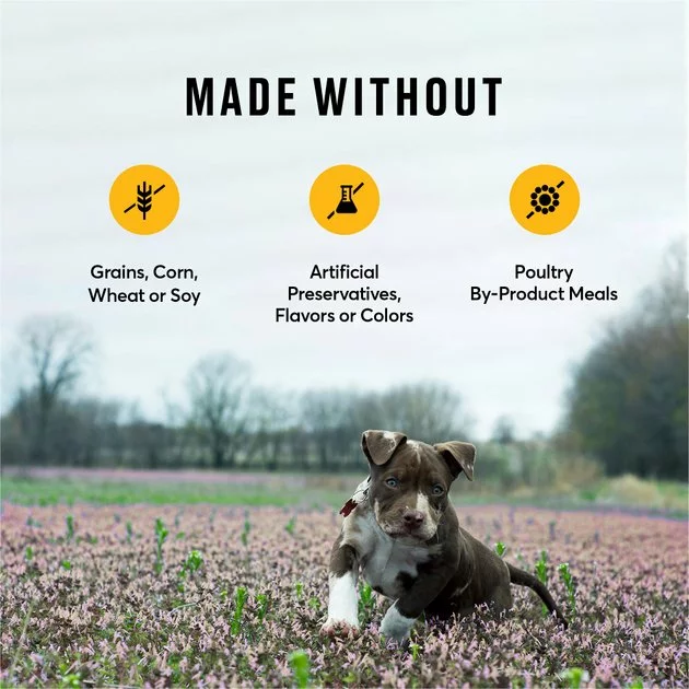 - Grain-free dog food for puppies that’s also free of corn, wheat and soy to help food sensitive pets avoid fillers that might upset their stomach.