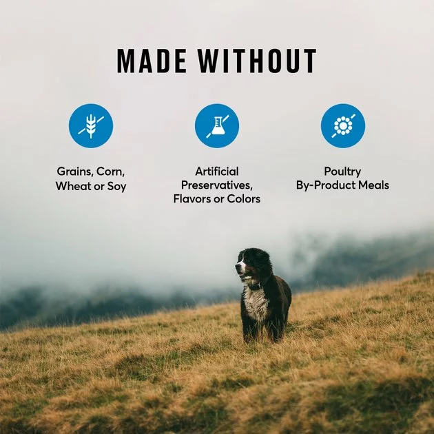 - Grain-free dog food that’s also free of corn, wheat and soy to help food sensitive pets avoid fillers that might upset their stomach.