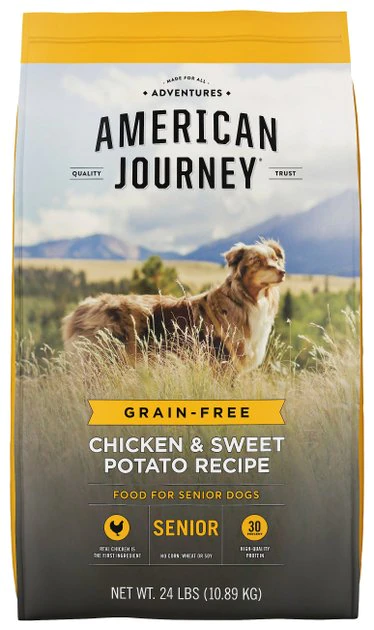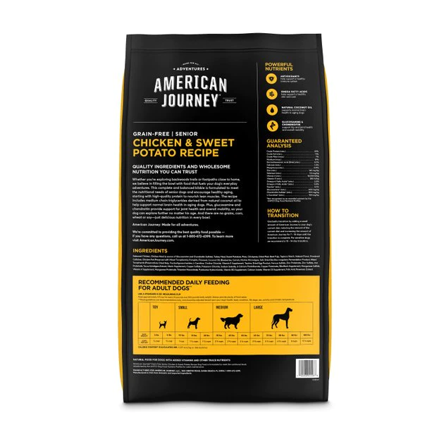 With age comes wisdom and a lot more adventures, when you feed your senior sidekick a meal that’s crafted just for him. To help keep dogs healthy and active at any age, American Journey Grain-Free Senior kibble is formulated with specially selected nutrients to support overall health in senior dogs. Medium chain triglycerides from coconut oil support brain health in aging dogs, antioxidants help support the immune system and omega fatty acids help maintain a healthy skin and coat. And to help keep him going wherever his adventures take him, glucosamine and chondroitin to support joint health and mobility. Every meal delivers a complete and balanced diet with real chicken as the first ingredient, along with essential vitamins and minerals, plus nutrient-dense ingredients like sweet potatoes, blueberries and mineral-rich marine algae. There are never any grains, wheat, corn or soy, or chicken or poultry by-product meals.