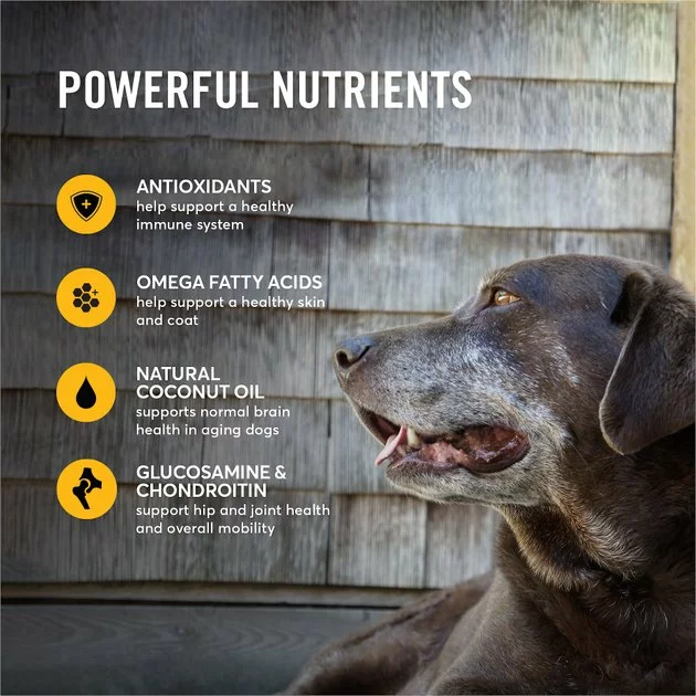 - Grain-free senior dry dog food helps support healthy aging with real chicken as the first ingredient, plus a blend of targeted nutrients.