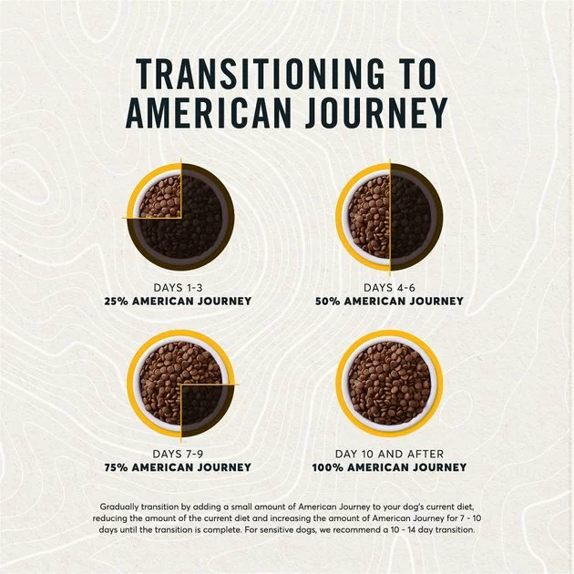 Gradually transition by adding a small amount of American Journey to your dog’s current diet, reducing the amount of the current diet and increasing the amount of American Journey for 7-10 days until the transition is complete. For sensitive dogs, we recommend a 10 – 14 day transition.
