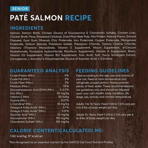 Serve up meals to keep your senior kitty thriving with recipes that are specially formulated to support a healthy life. Real salmon is the first ingredient and provides high-quality animal protein in a smooth paté texture that’s perfect for sensitive teeth. 100% complete and balanced, every recipe includes natural fiber and prebiotics to promote digestive health, DHA and taurine to support brain and heart health, and glucosamine and chondroitin to support healthy joints. Let your senior kitty savor all the special moments ahead with healthy recipes crafted with the nutrition they need and the protein they crave.