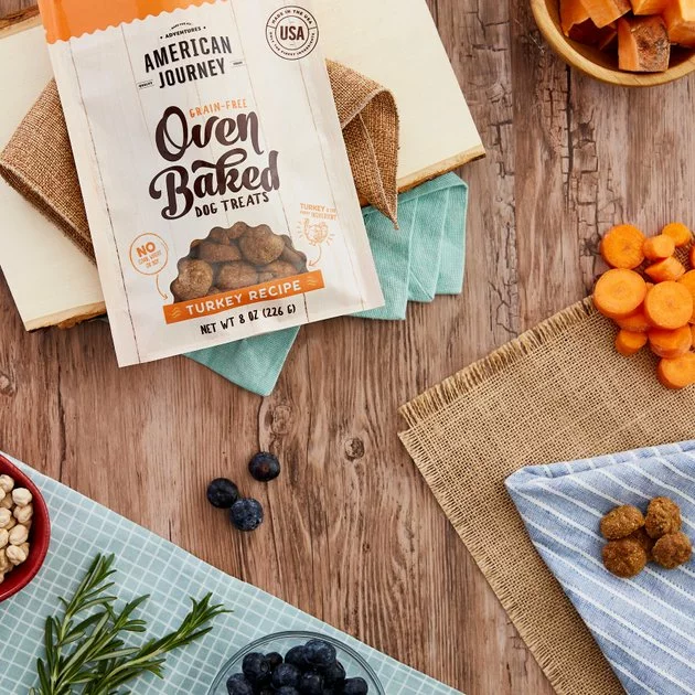 American Journey Turkey Recipe Grain-Free Oven Baked Crunchy Biscuit Dog Treats are grain-free, crunchy snacks sure to please your pup whether you’re both on the go or right at home. Small but full of flavor, these bite-size treats are made with wholesome ingredients that will keep your pup energized for any daily adventure ahead. Every bite is packed with the crispy crunch that could only come from a treat that’s perfectly baked right in the oven! Real, high-quality turkey comes first, followed by tasty veggies and fruits, including sweet potatoes, carrots, pumpkins, blueberries and apples. And these naturally preserved, filler-free treats are also free of poultry by-product meal and artificial colors, flavors and preservatives. Treat your dog to quality and taste with American Journey Grain-Free Oven Baked Treats.